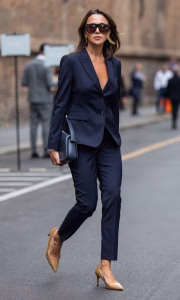 El azul navy, símbolo de autoridad, disciplina y elegancia atemporal, sigue siendo un color esencial en cualquier guardarropa. Este tono profundo y estable evoca calma y confianza, atributos que lo convierten en un referente de estilo en todo el mundo. Adoptado originalmente por la Marina Británica en el siglo XVIII por su practicidad y sobriedad, el azul navy es ahora un sinónimo de poder y sofisticación, como se refleja en este total look. Con un traje impecable en azul marino, acompañado de un bolso y gafas de sol a juego, complementado con tacones beige, este estilismo demuestra cómo este tono sigue dominando las tendencias actuales, adaptándose tanto a la moda masculina como femenina con un toque de modernidad.