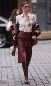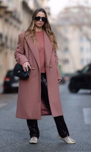 El rosa pastel, como el de la chaqueta de Zara de la reina Letizia, se ha consolidado como uno de los colores más destacados de la temporada, y no solo se limita a los románticos vestidos, sino que ahora también se apodera de prendas de abrigo, piezas de sastrería y accesorios, aportando un toque dulce y moderno a cualquier look. Este tono, estrechamente relacionado con la fantasía y el optimismo, ha cobrado fuerza gracias a la popularidad del personaje de Glinda, interpretado por Ariana Grande en la película Wicked, cuya paleta se centra en el rosa polvo. En la imagen, el rosa oscuro se incorpora con sofisticación en un estilo de street style, con un jersey y una gabardina de este color, combinados con unos pantalones negros con lentejuelas, gafas de sol negras y zapatillas blancas y rosa oscuro. Este look demuestra cómo el rosa pastel, más allá de su tradición romántica, es un color versátil que puede llevarse con actitud y elegancia en diferentes contextos.