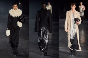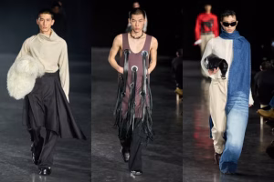 Una paleta de colores oscura, abrigos anchos pero ceñidos en la cintura con amplios cinturones, «una confección estricta, muy formal», reconoció Kevin Nompeix, uno de los dos creadores, a los periodistas al término del desfile. Pero con toques de fantasía, como los pulóveres de lana agujereados con anillas metálicas, de las que surgen penachos de cuero.